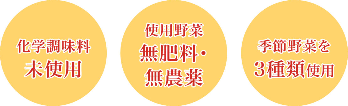 化学調味料を使用せず、無肥料・無農薬野菜を使用し安心して召し上がって頂けるよう料理をしております。