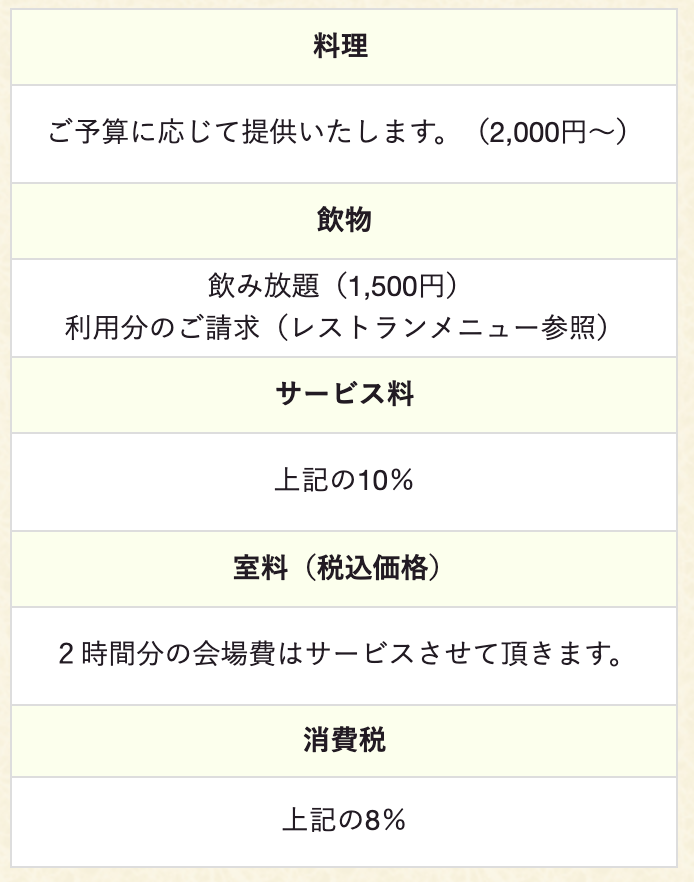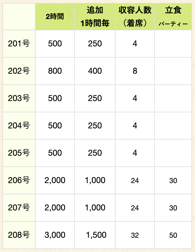 室料(税込価格) | 2時間分の会場費はサービスさせて頂きます。 |